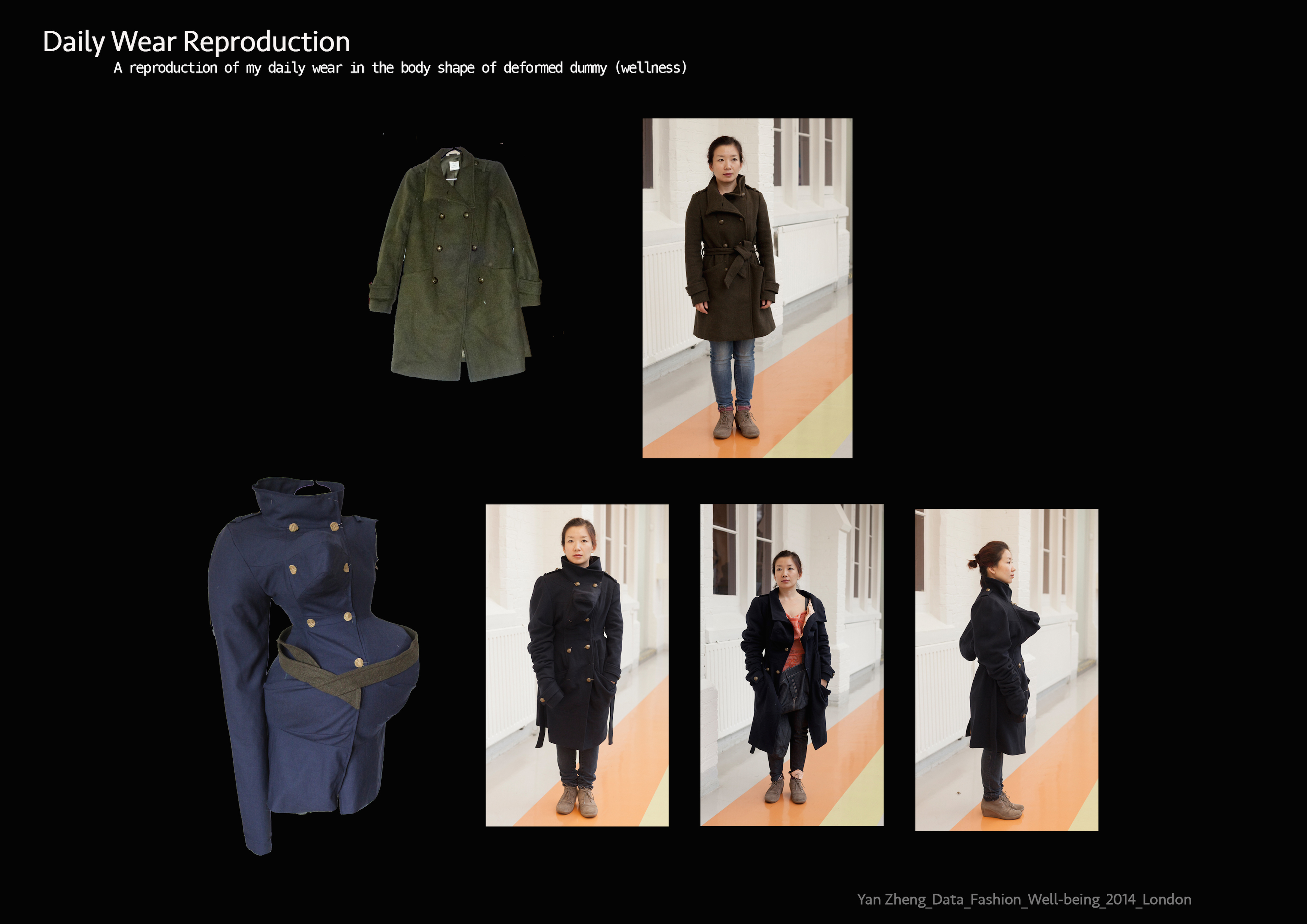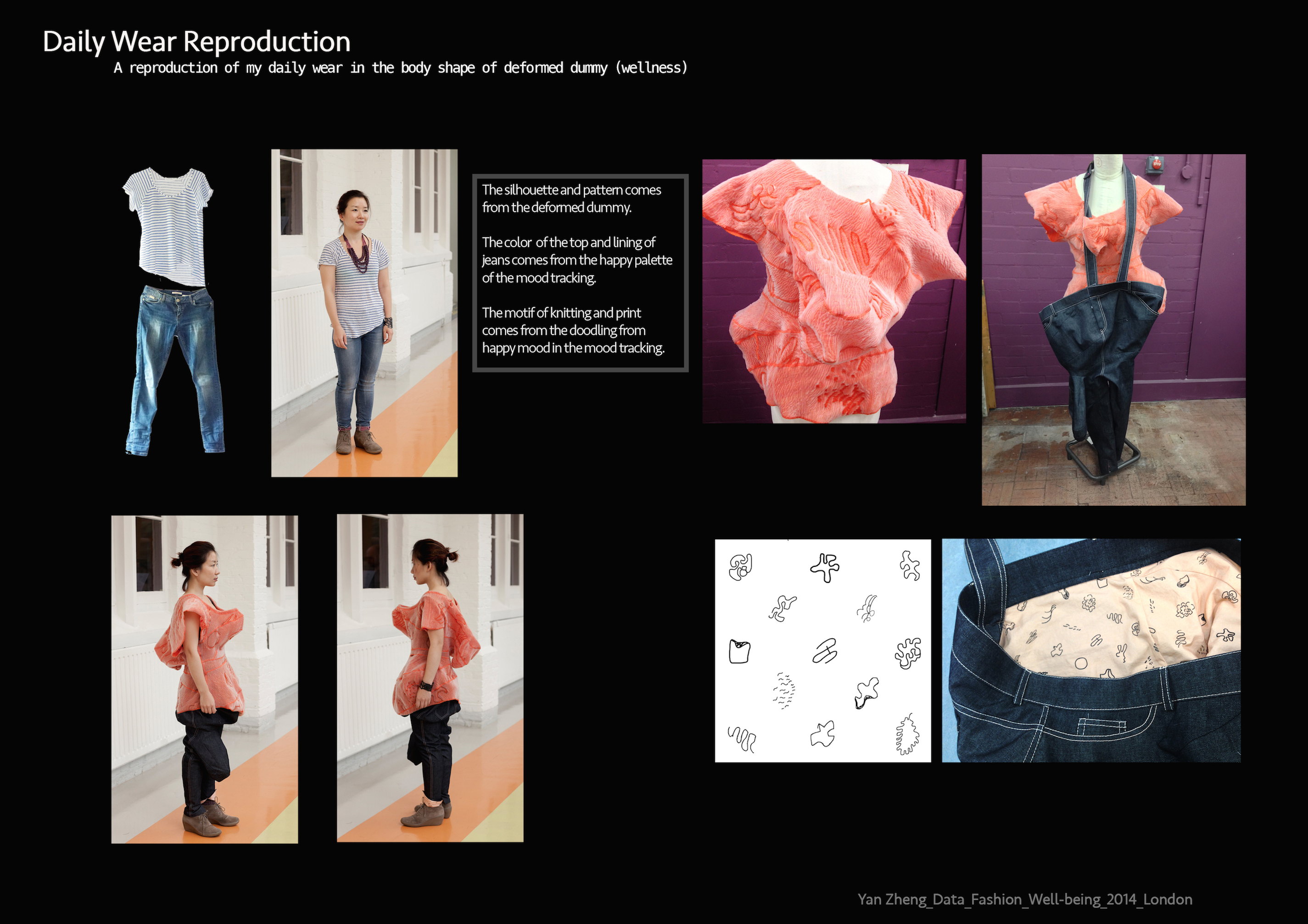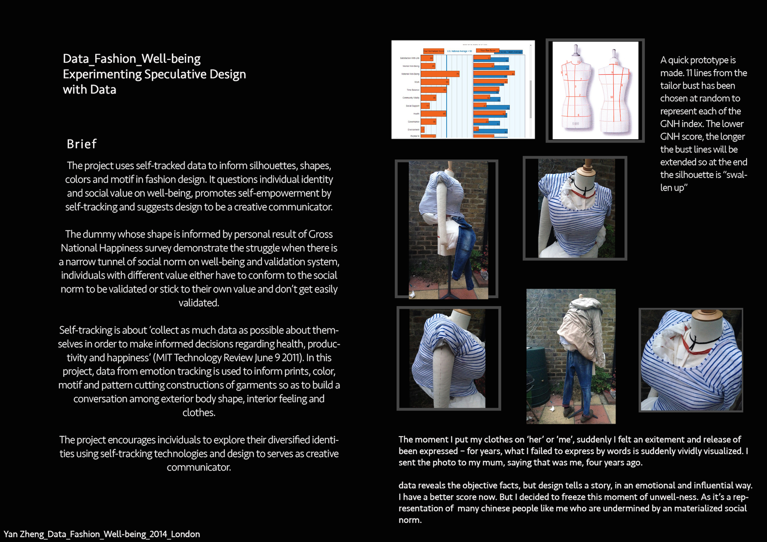 The project uses self-tracked data to inform fashion design process. It questions individual identity under the social norm on well-being, promotes self-empowerment by self-tracking and suggests design to be a creative communicator.